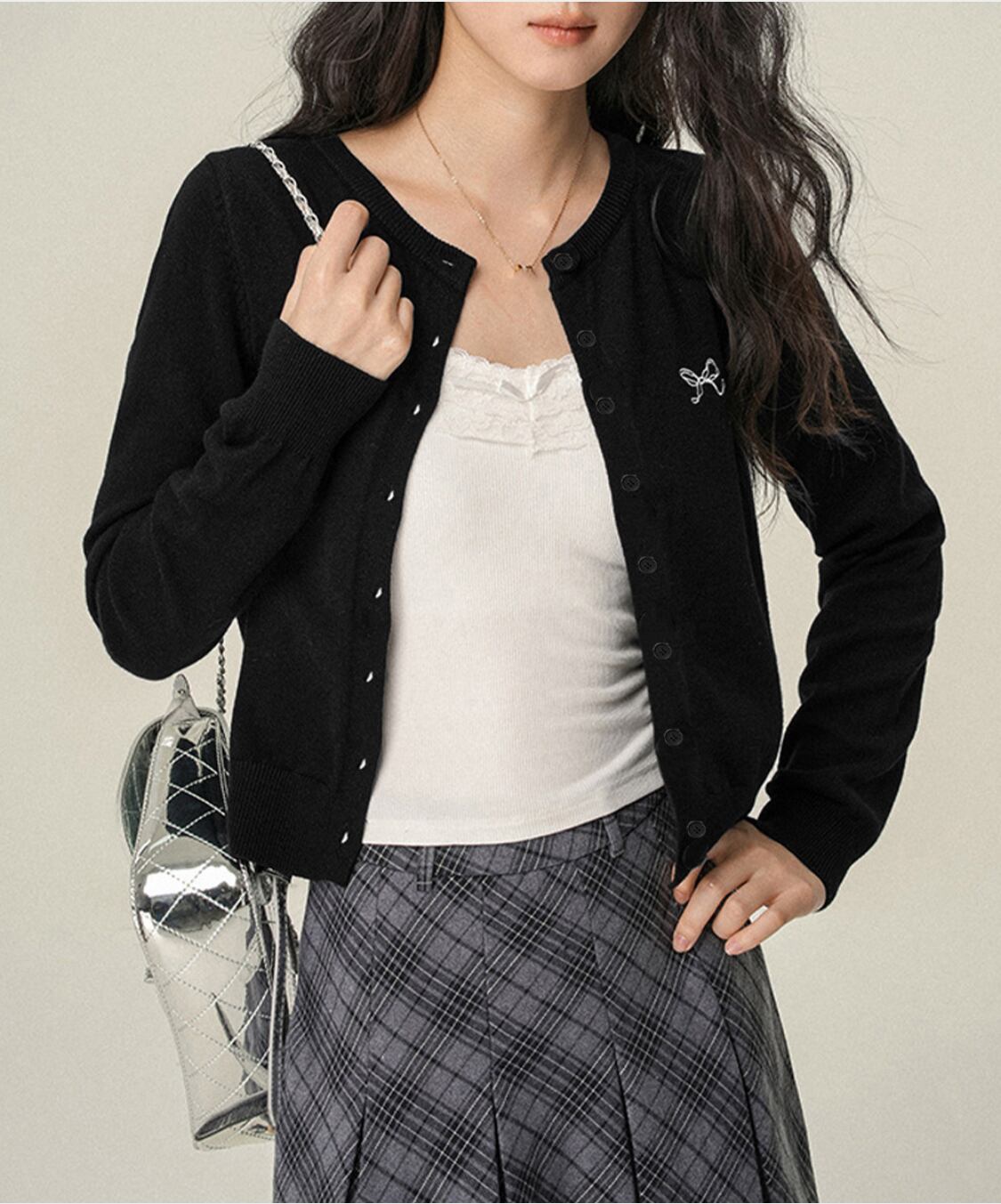 ベーシック 春秋服/着やせニット 無地/ショート丈カーデ黒