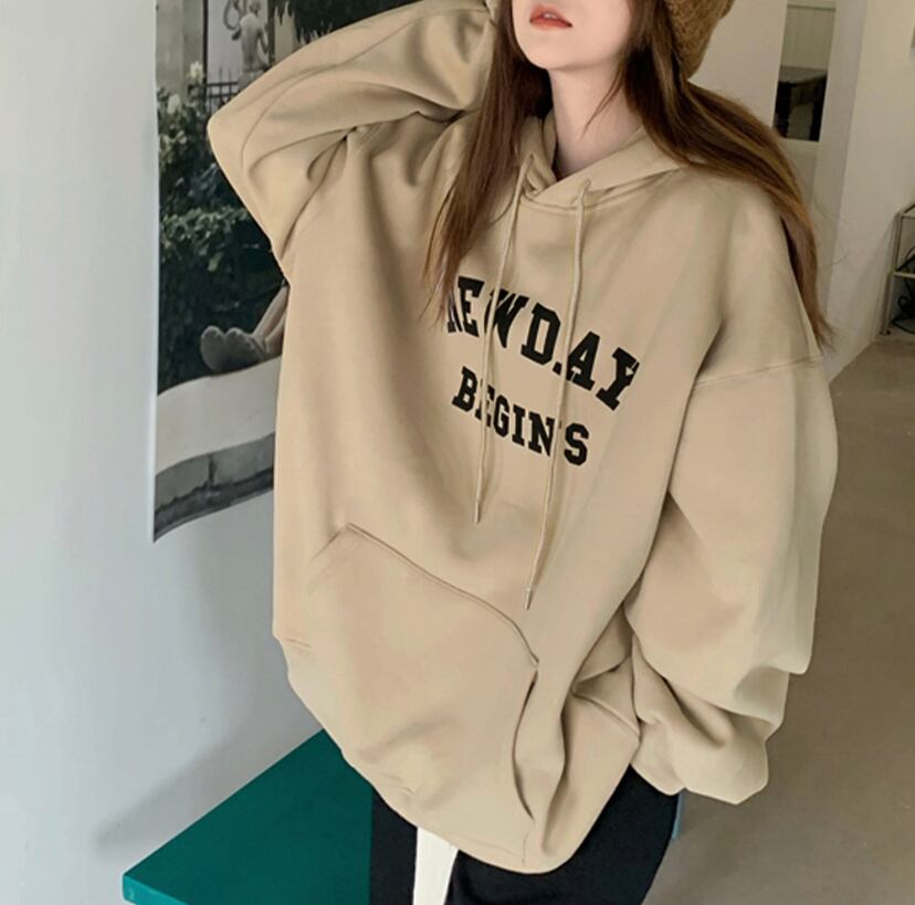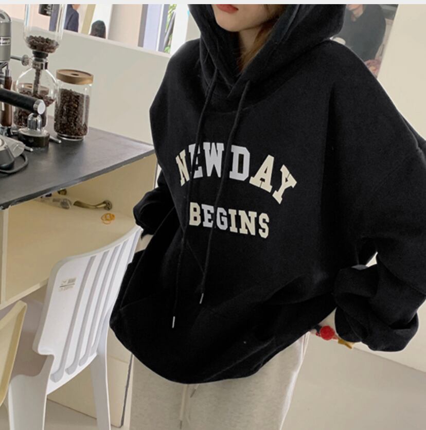 長袖ロゴパーカー黒 裏フリーストップス ゆるシルエット韓国