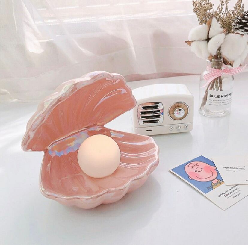 貝殻の中にアクセサリーや小物を置いたり、ちょっとしたオブジェとしても使える小ぶりなテーブルランプです。高級感を出す為、パール加工を施しました。ライトをつけると貝殻の上蓋部分が影となり、パールがきれいに光るようになっています。ライト部分とシェルが分かれているので、ライトをはずして貝殻のオブジェ、アクセサリー置きとしてもご使用できます。貝殻トレーは陶器で出来ており、また、表面には高級感のあるパール加工仕上げを施しました。暖色カラーのLEDライトをつけると貝殻の上部に影がかかり、キラキラときれいに光ります。幻想的な雰囲気が、お部屋を心地のよい癒しの空間へと変えてくれます。
