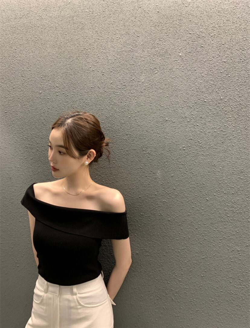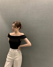 #計算された美シルエット #韓国ファッション #ボーダー #オフショルダー #半袖 #ニットトップス #デザインセンス