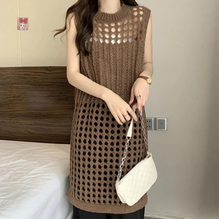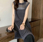 チュニックニットベスト レディース ノースリーブニットトップス ゆったり 無地レイヤードワンピース 透かし編みベスト春夏