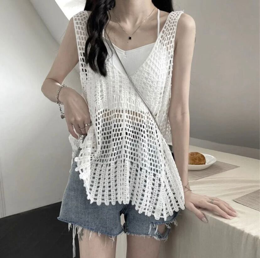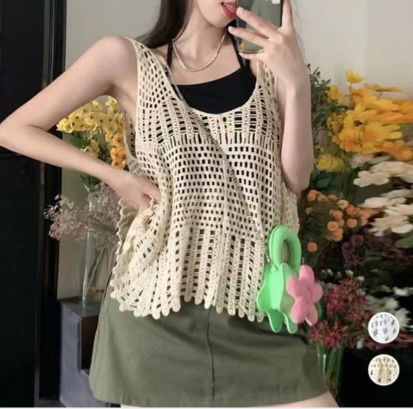 重ね着 シンプル 透かし編みベスト春夏 セクシー タンクトップ 韓国風 クロシェ編み ニットトップス