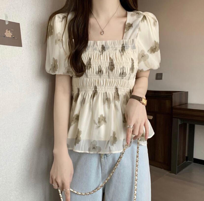 韓国ファッション スクエアネック ブラウス 春夏 シャーリング トップス パフスリーブ きれいめ ブラウス ペプラムヘム